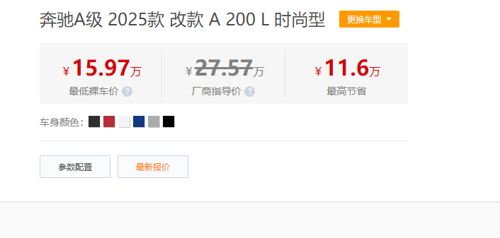 近期豪华车市场掀起降价风暴,奔驰A级以史无前例的优惠力度震撼全场——原指导价25.13万的A 180 L,叠加终端优惠与区域补贴后,裸车价低至15.97万起,最高让利超11万,让“15万开奔驰”从梦想照进现实。这波诚意满满的调价,不仅打破了入门豪华车的价格壁垒太原股票配资,更让不少老车主直呼“后悔买早了”。