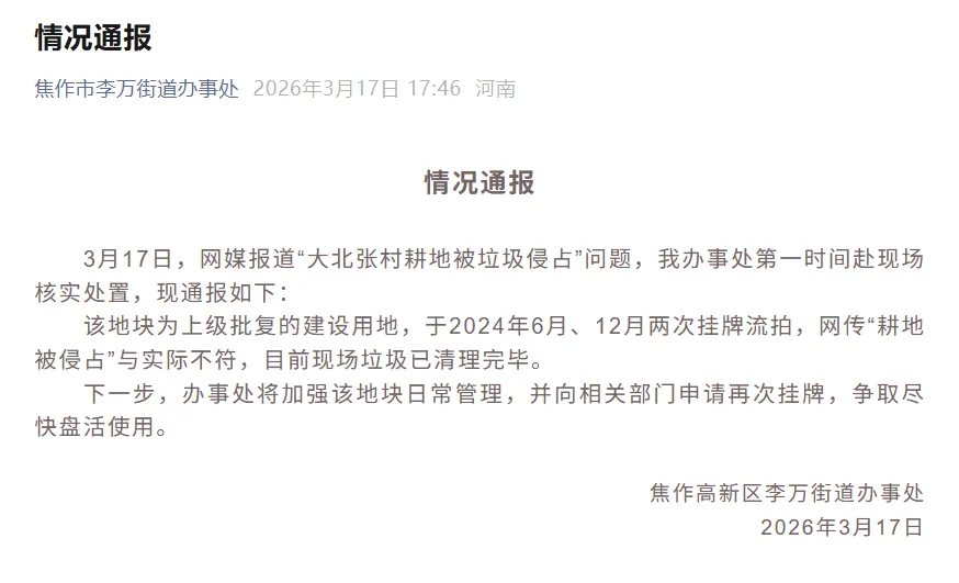 针对媒体报道的问题,焦作市李万街道办事处于3月17日下午发布情况通报,第一时间赶赴现场核实处置。